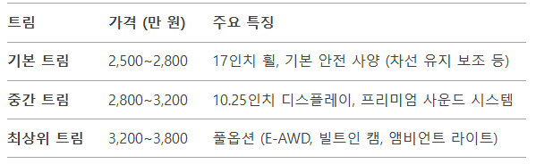 - 구동 방식: FWD 기본, E-AWD (전자식 4륜구동) 옵션.