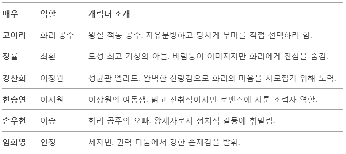 동방국의 적통 공주 화리(고아라)는 정략결혼을 거부하고 직접 부마를 선택하기 위해 궁을 떠납니다. 도성 최고의 바람둥이 최환(장률)과 완벽한 신랑감 이장원(강찬희) 사이에서 갈등하며, 정치적 음모와 맞서 자유로운 사랑을 추구하는 이야기입니다