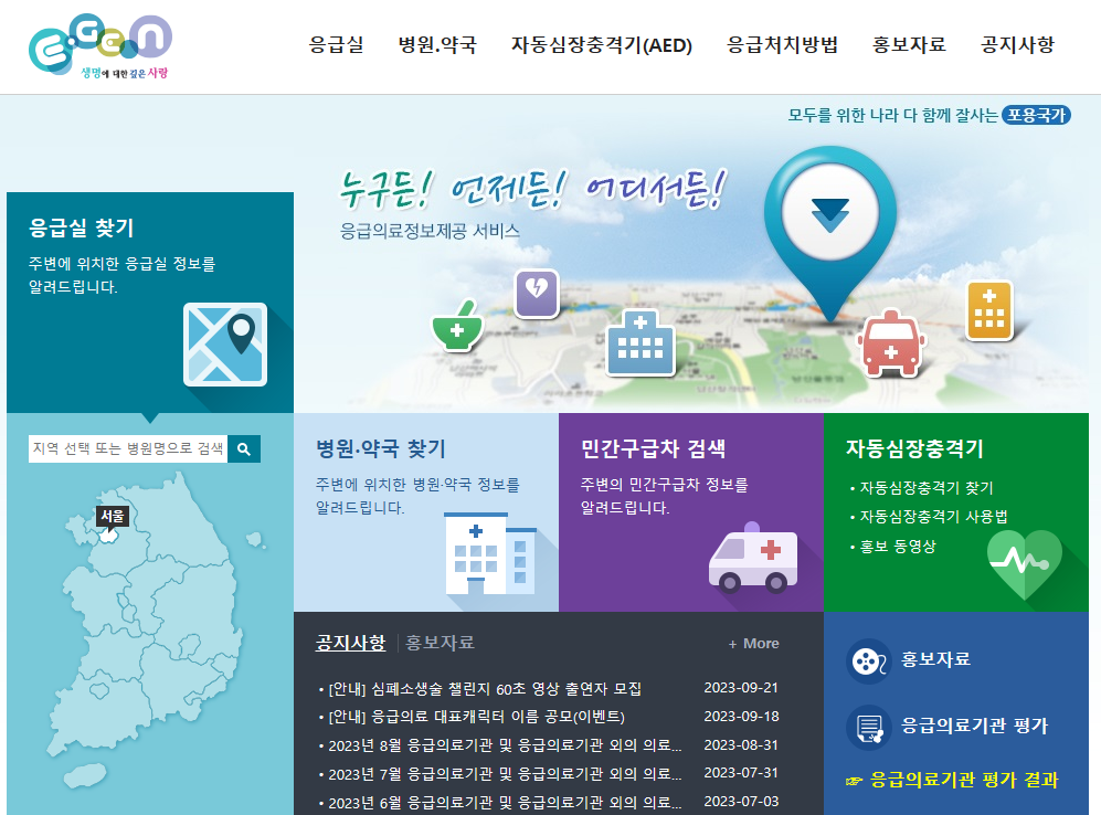 위의 약국 시스템과 마찬가지로 응급한 상황에 방문할 수 있는 병원을 정리해 둔 사이트가 있습니다. 바로 응급의료포털이라는 사이트입니다.