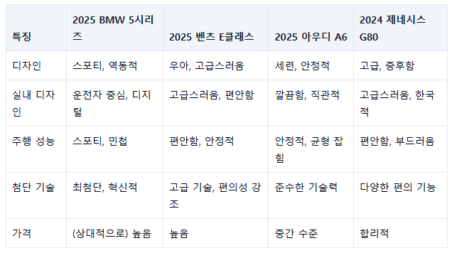 2025 BMW 5시리즈는 메르세데스-벤츠 E클래스, 아우디 A6, 제네시스 G80 등 다양한 경쟁 차종과 경쟁합니다.
