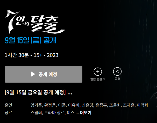 7인의 탈출은 OTT에서 함께 시청할 수 있습니다. 쿠팡플레이와 웨이브에서 제공이 되는데 쿠팡플레이에선 9월 15일에 공개될 예정입니다.